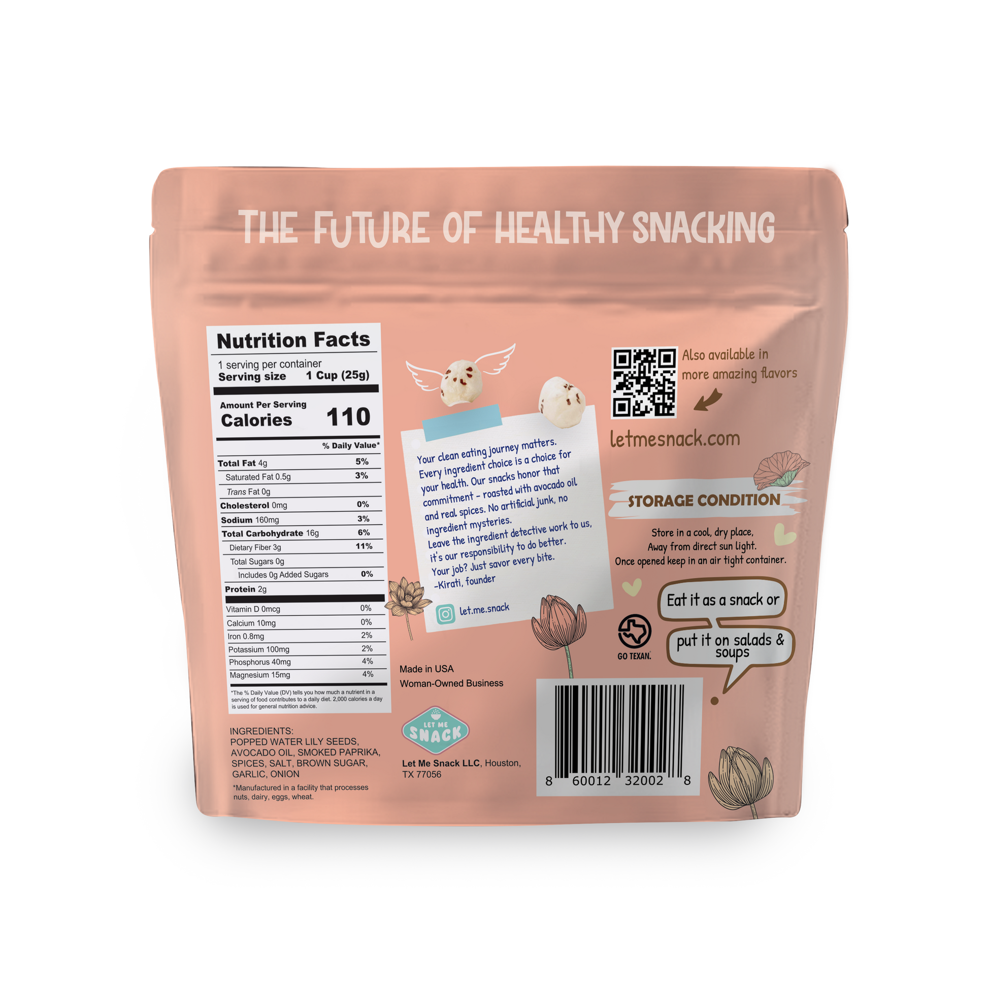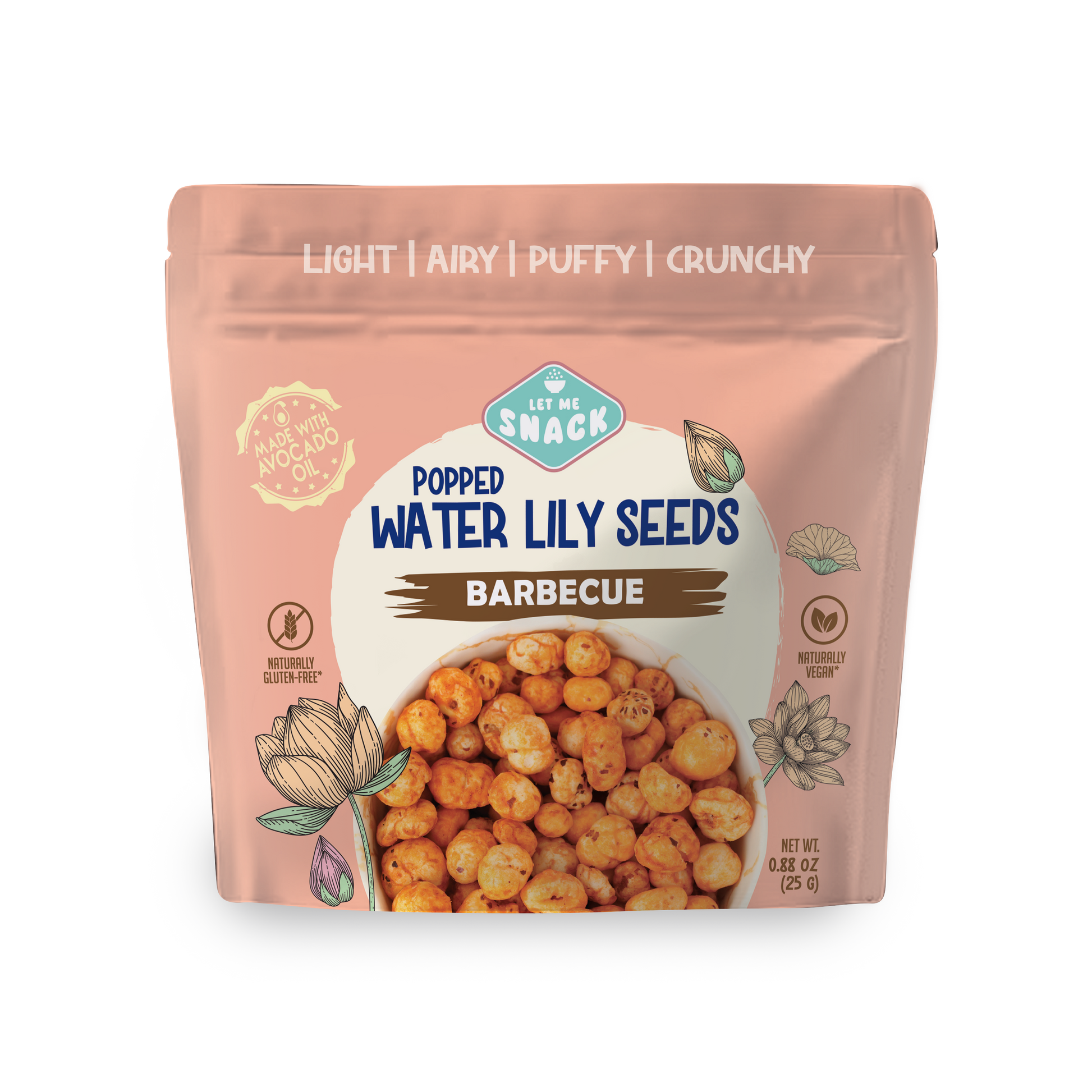 Ingredients: Popped Water lily seeds, Avocado oil, Smoked Paprika, Spices, Salt, Garlic,Onion, Brown Sugar