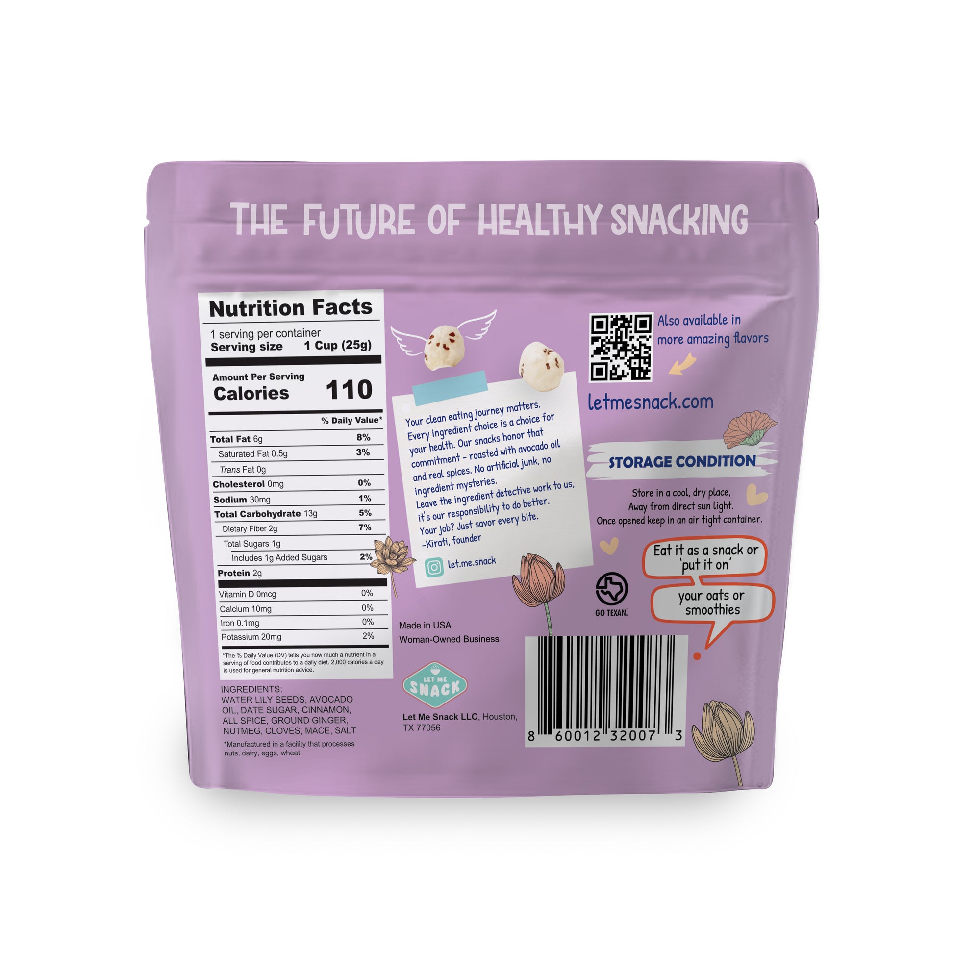 Ingredients: Popped Water lily seeds, Avocado oil, Date Sugar, Cinnamon, Nutmeg, Cloves, Allspice, Ground Ginger, Mace, Salt